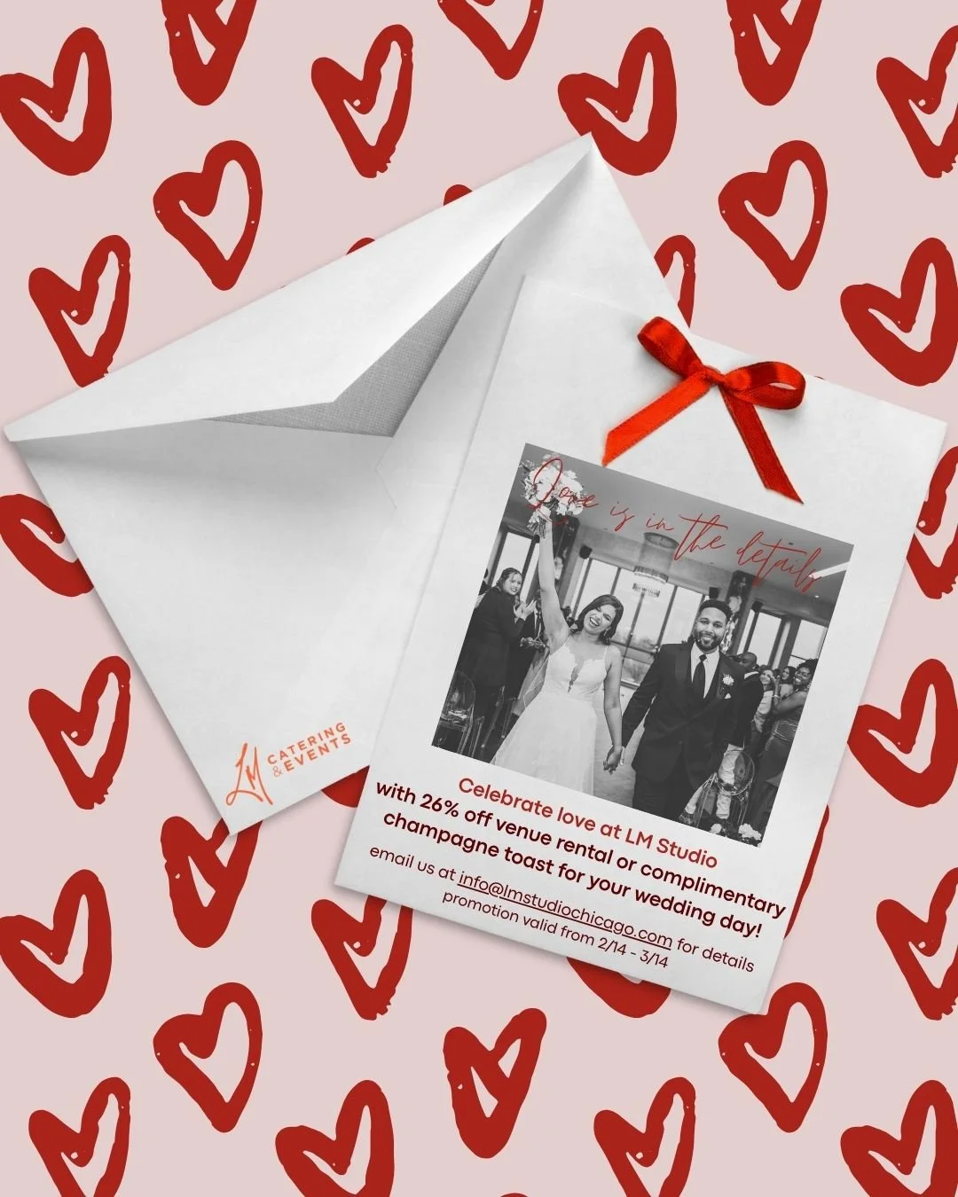 In the spirit of love, we’d love to extend an exclusive offer! Book your wedding between Valentine’s Day and 3/14, and choose 26% off your venue rental fee or a complimentary champagne toast! Contact us for details, info@lmstudiochicago.com